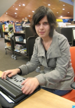 Marie travaille sur un ordinateur en braille qui lui permet de transcrire ce qu'elle entend. |